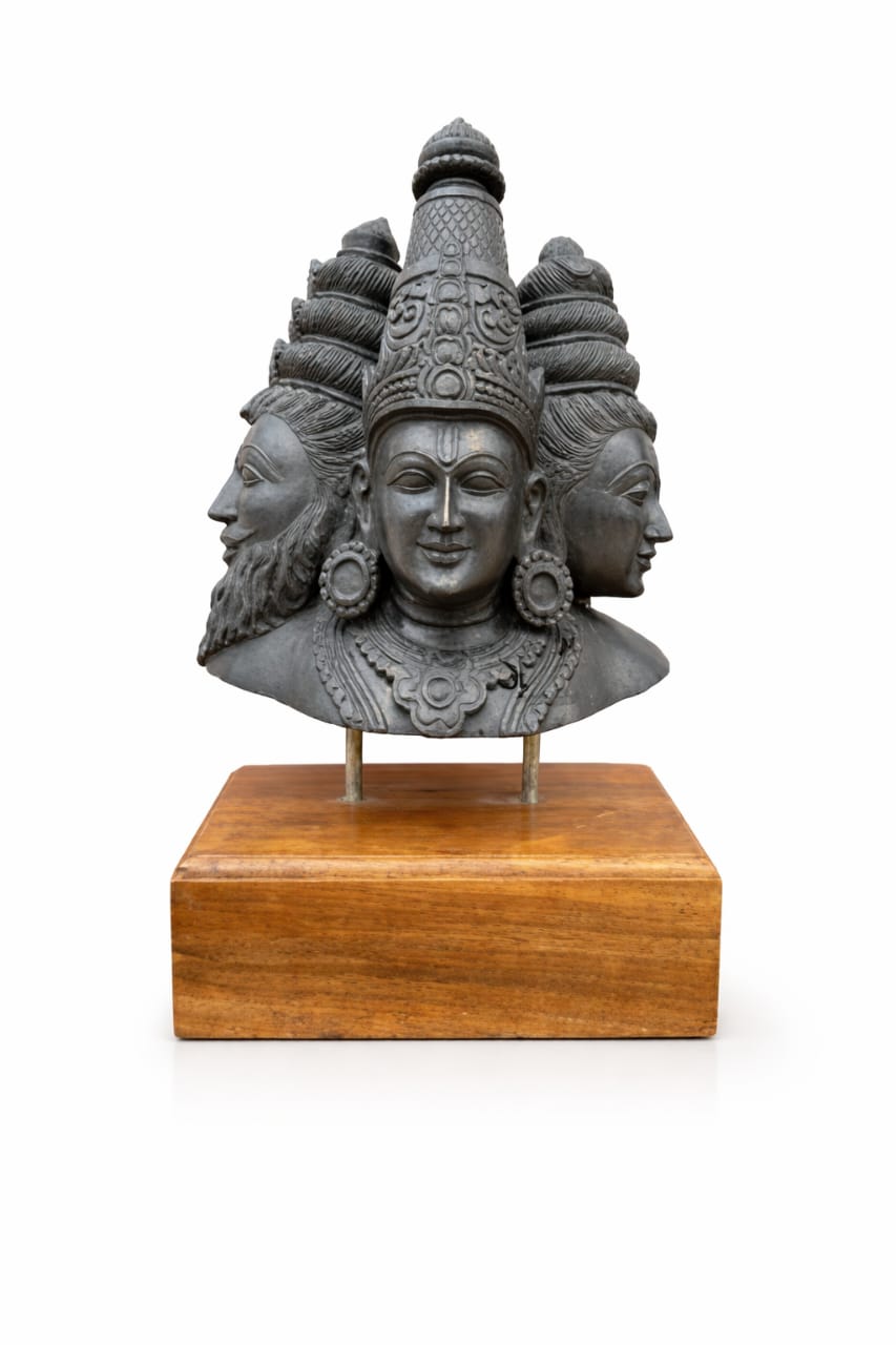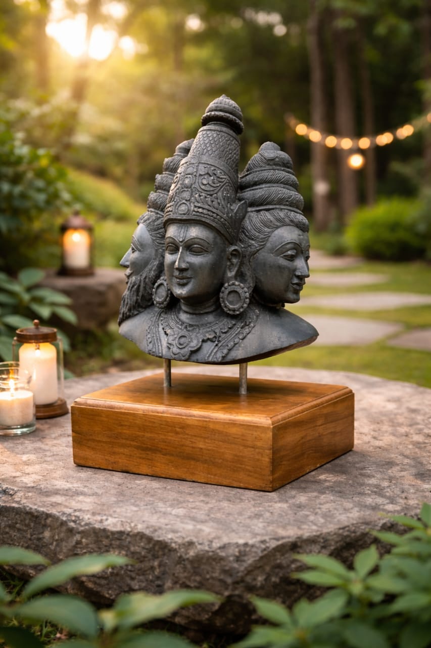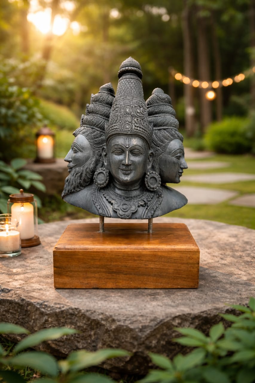 Tridev – The Eternal Trinity represents the unified force of creation, preservation, and transformation. The sculpture brings together Brahma, Vishnu, and Shiva into a single balanced form, symbolizing cosmic harmony.