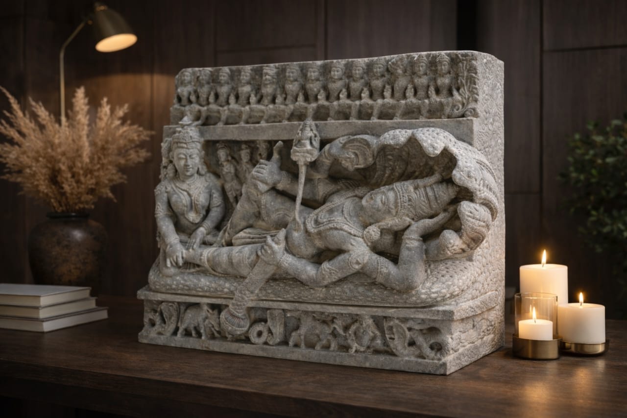 Vishnu – Cosmic Slumber represents rest, balance, and universal order. The reclining form conveys calm continuity.